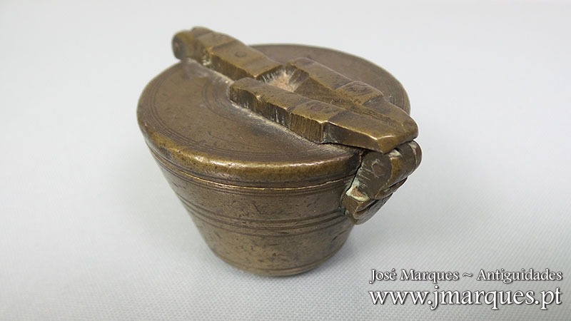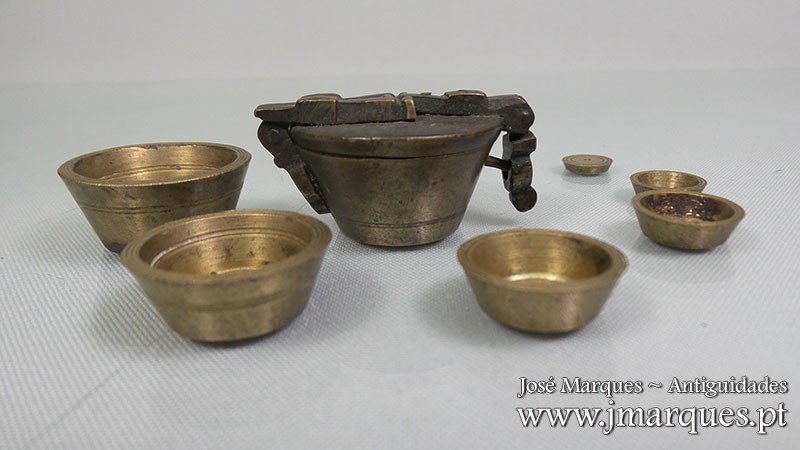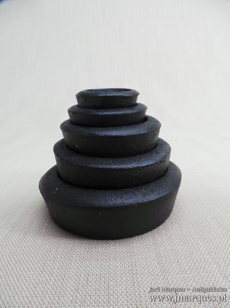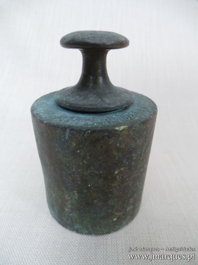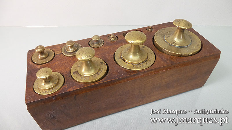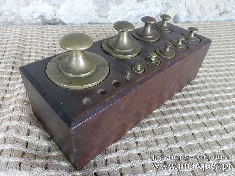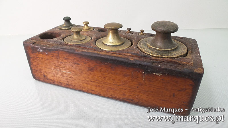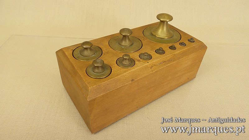 Cepo antigo em madeira com sete pesos faltam seis pesos. Peça antiga com sinais de uso. As medidas apresentadas são do cepo.