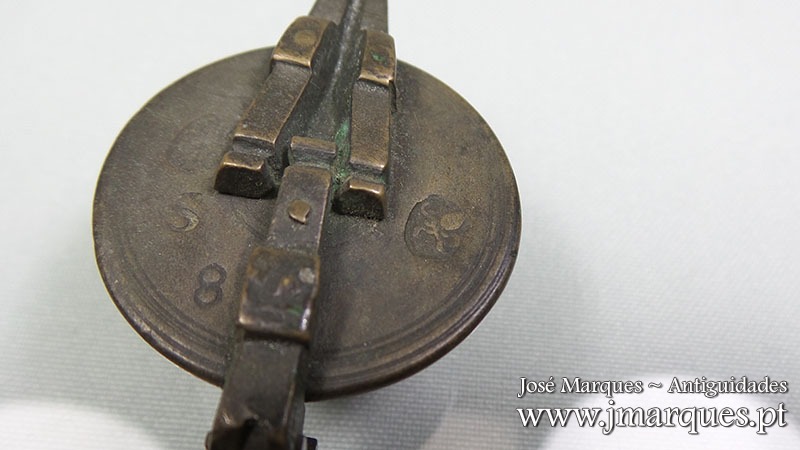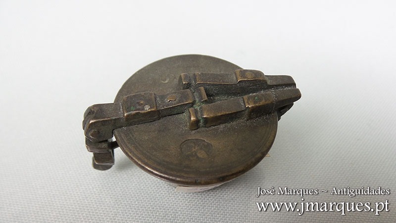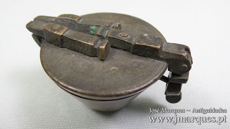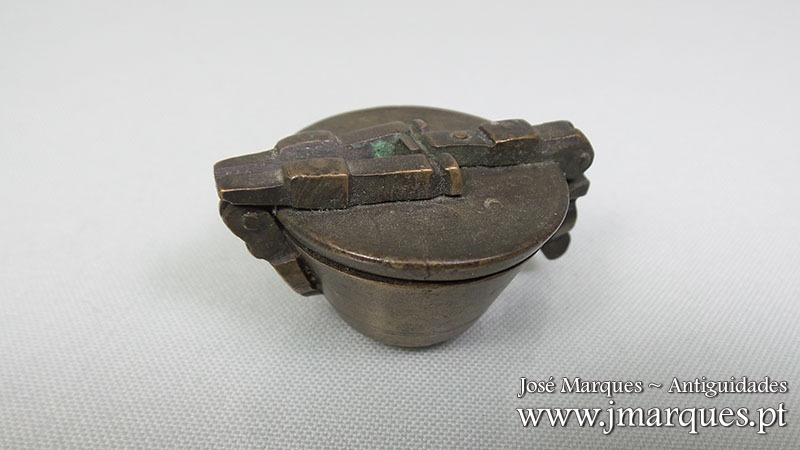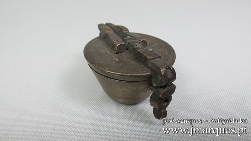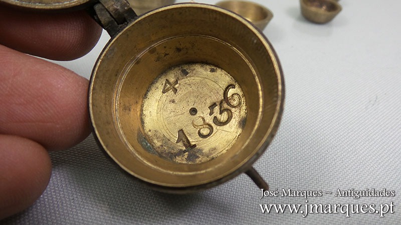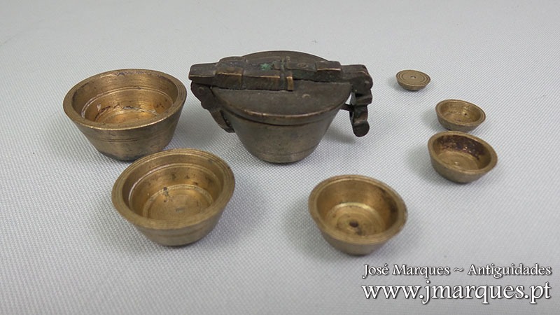 Caixa de pesos antiga em bronze completa com seis pesos. Com marcações na tampa, fecho impecável. Ano de 1836. Séc. XIX.